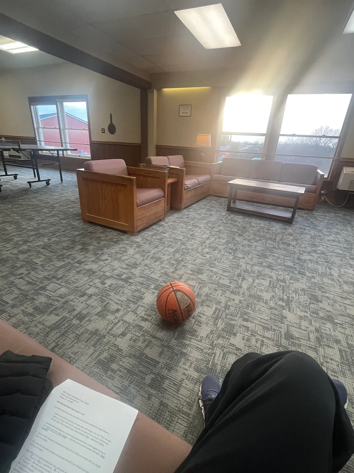 Then something prompted me to open my eyes, and a basketball was rolling towards me, and it stopped right in front of me. As you can see in the photograph below, there was no one else in the room at the time (no other humans, at least... lol). The door was open, so the basketball rolled in from the gym and brought my attention back to the kids screaming, hootin’ and hollering and having a blast. I burst out laughing.